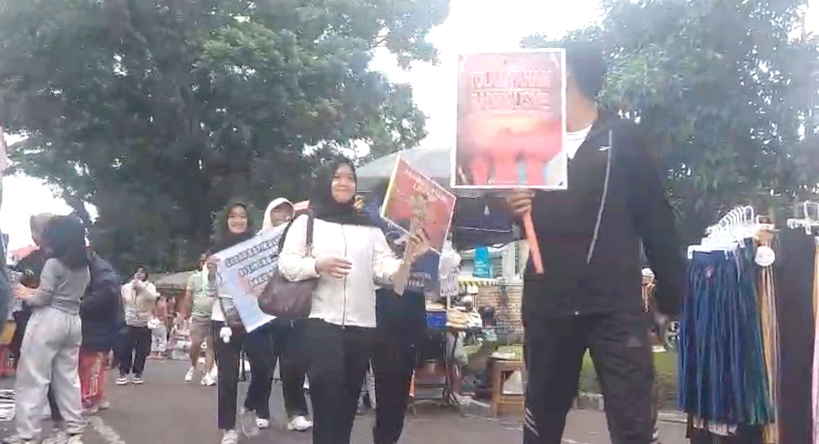 Para peserta membawa alat peraga sosialisasi dan berinteraksi langsung dengan warga yang berolahraga di area CFD untuk mengajak mereka menolak segala bentuk kekerasan, radikalisme, korupsi, judi online, dan narkoba.